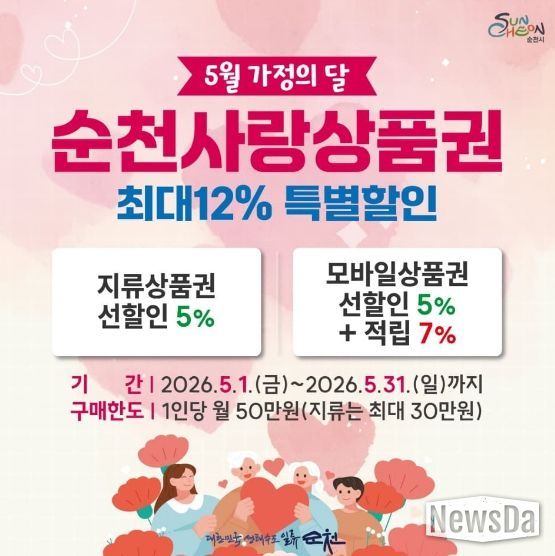 뉴스다 최광묵 기자 | 순천시가 5월 한 달간 순천사랑상품권 특별 할인행사를 추진해 시민들의 가계 부담을 덜고 지역 소상공인에게 활력을 불어넣는 소비 촉진에 나선다.