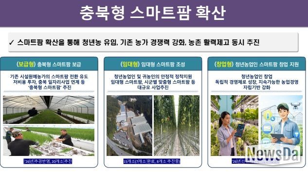 뉴스다 최광묵 기자 | 충청북도가 청년농업인의 안정적 정착과 기존 농업인의 경쟁력 강화, 미래형 농업 전환을 위해 스마트팜 확산 3대 전략을 본격 추진한다고 밝혔다.