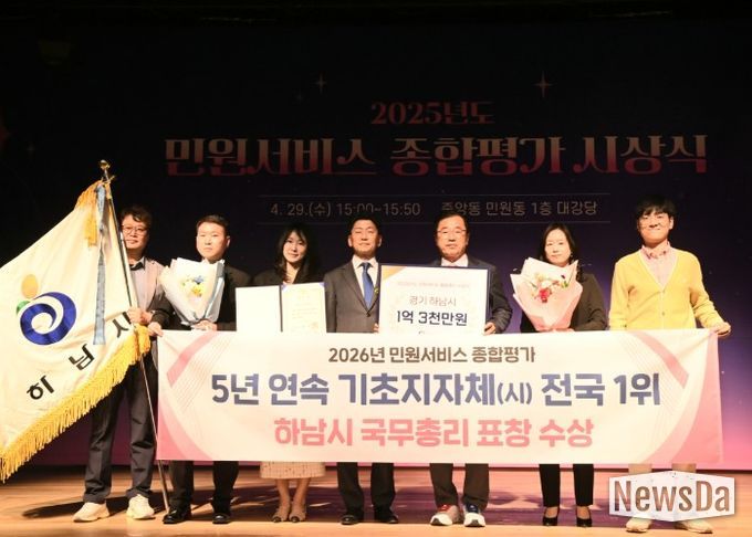 뉴스다 최광묵 기자 | 하남시가 전국 기초자치단체 중 최고 수준의 민원서비스 역량을 인정받으며 5년 연속 최우수 기관으로 선정됐다. 하남시는 29일 정부세종청사에서 열린 ‘2025년 민원서비스 종합평가’ 우수기관 시상식에서 국무총리 표창을 수상했다고 밝혔다.