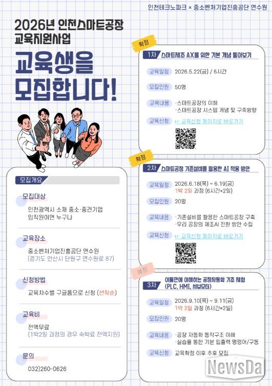 뉴스다 최광묵 기자 | 인천테크노파크(인천TP)는 지역 중소·중견기업의 제조혁신 역량 강화를 위해 ‘2026년 인천스마트공장 교육지원사업’ 교육생을 모집한다.