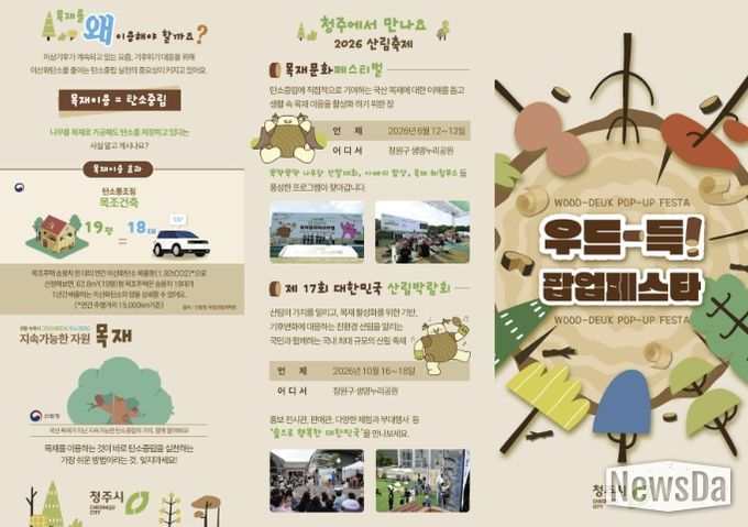 뉴스다 최광묵 기자 | 청주시는 오는 5월 7일부터 10일까지 청원구 생명누리공원에서 목재문화 체험행사 ‘우드-득! 팝업페스타’를 운영한다고 밝혔다.