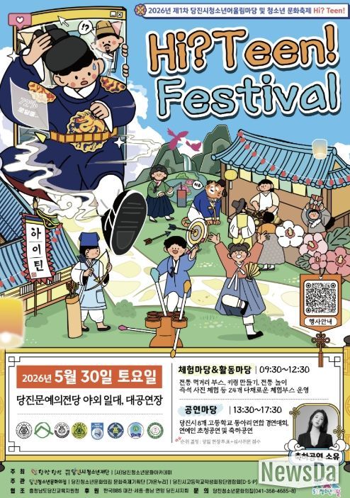 뉴스다 최광묵 기자 | 5월 30일 토요일, 당진문예의전당에서 2026년 제1차 당진시청소년어울림마당 및 청소년 문화축제 [Hi? Teen!]이 개최된다. 이번 행사는 ‘전통’을 중심으로 영화 ‘왕과 사는 남자’를 모티브로 기획됐으며, 현대와 조선을 넘나드는 색다른 분위기 속에서 청소년이 직접 기획·운영하는 참여형 축제로 마련됐다.
