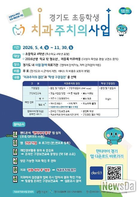 뉴스다 최광묵 기자 | 경기도가 4일부터 초등학교 4학년생 11만명을 대상으로 예방 중심의 구강 관리 서비스를 제공하는 ‘2026년 초등학생 치과주치의 사업’을 시행한다.