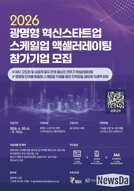 시는 오는 5월 10일까지 ‘2026년 광명형 혁신스타트업 스케일업 액셀러레이팅’ 참가기업을 모집한다.