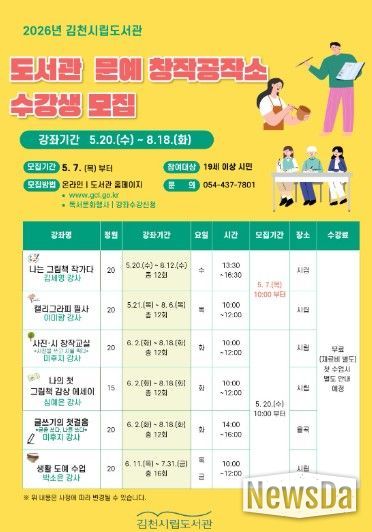 뉴스다 최광묵 기자 | 김천시립도서관은 시민의 문화적 역량을 높이고 창작 활동을 지원하기 위해 오는 5월 20일부터 8월 18일까지 '2026 문예 창작공작소'를 운영한다고 밝혔다.