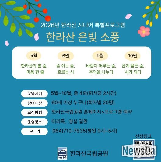 뉴스다 최광묵 기자 | 제주특별자치도 세계유산본부 한라산국립공원관리소는 5월부터 10월까지 총 4회에 걸쳐 어리목, 영실 일대에서 시니어를 위한 특별프로그램‘한라산 은빛 소풍’을 운영한다.