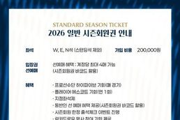 뉴스다 류대현 기자 | 김천상무가 시즌회원, 어린이 시즌회원, 티켓북으로 폭넓은 관람 선택지를 제공한다. 김천상무프로축구단(대표이사 이재하)이 1월 30일 14시부터 시즌회원, 어린이 시즌회원, 티켓북 판매를 시작했다. 먼저 시즌회원은 W, E, N석(스탠딩석 제외)에서 이용 가능하며, 가격은 20만 원이다. 수량은 50매 한정이다. 구매자에게는 시즌회원 카드와 랜야드, 신규 MD 응원 머플러가 제공된다. 또한 지정좌석제 운영과 함께 계정당 최대 4매까지 선예매 혜택이 주어지며, 매 경기 프로선수단 하이파이브, 연 1회 플레이어 에스코트, 시즌회원 한정 출석체크 이벤트, 럭키드로우 행사 참여, 구단 행사 우선 참여 등의 혜택을 누릴 수 있다. 어린이 시즌회원은 W, E, N석(스탠딩석 제외)에서 이용 가능하며, 가격은 14만 원이다. 수량은 100매로 한정 판매된다. 구성품은 어린이 시즌회원 카드, 랜야드, 바람막이로 구성되어 있다. 어린이 시즌회원에게도 계정당 최대 4매까지 선예매 혜택이 제공되며, 매 경기 프로선수단 하이파이브 기회(동반 2인 포함, 유료 티켓 소지자에 한함)와 연 1회 플레이어 에스코트