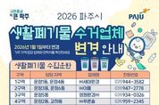 뉴스다 최광묵 기자 | 파주시는 2026년 1월 1일부터 관내 생활폐기물(쓰레기) 수집·운반 대행업체가 변경됨에 따라, 시민에게 정확한 정보를 안내하고 현장 운영이 원활히 정착될 수 있도록 홍보와 안내를 강화하고 있다고 밝혔다. 이번 대행업체 변경으로 지역별 담당 업체가 달라졌으며, 특히 문산읍의 경우 세부 지역(리 단위)에 따라 담당 업체가 서로 다를 수 있어 시민들의 각별한 주의가 필요하다. 변경된 담당 업체 정보는 파주시청 누리집에서 확인하거나, 자원순환과 청소행정팀 및 민원전화상담실(콜센터)로 문의하면 안내받을 수 있다. 파주시는 시민 혼선을 최소화하기 위해 변경 사항을 지속적으로 홍보하는 한편, 대행업체와 협력해 현장 안내를 강화하고 주민 문의에 신속히 대응해 나갈 계획이다. 심재우 자원순환과장은 “대행업체 변경 초기에는 일시적인 혼선이 발생할 수 있다”라며 “현장 점검을 강화해 수거 지연 등 문제를 신속히 해소하고 청소 행정이 조기에 안정될 수 있도록 노력하겠다”라고 밝혔다.