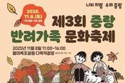 뉴스다 최광묵 기자 | 중랑구는 오는 11월 8일 토요일 오전 11시부터 용마폭포공원 다목적 광장에서 ‘제3회 중랑 반려가족 문화축제’를 개최한다. 중랑구가 주최하고 ㈜한국어질리티연합이 주관하는 이번 축제는 반려인과 비반려인 모두가 함께 즐기며 사람과 동물이 조화롭게 공존하는 문화를 조성하기 위해 마련됐다. 축제는 무대존, 플레이존, 부스존 등 3개 구역에서 다채로운 볼거리와 즐길 거리를 제공한다. 개회식은 오후 1시부터 류경기 중랑구청장 등 주요 내빈과 지역 주민 200여 명이 참석한 가운데 진행된다. 사전 공모된 ‘2025 중랑 유기동물 입양 사진·수기 공모전’ 시상식이 함께 열리며, 시상식 이후에는 반려견 능력시험과 더불어 행운권 추첨 등 다양한 프로그램이 진행돼 축제의 흥을 돋울 예정이다. 무대존에서는 중랑 K-댕댕이 헌터즈 펫션쇼와 같은 다양한 프로그램이 하루 종일 펼쳐진다. 플레이존은 반려 스포츠와 활동적인 체험 공간으로 구성된다. 펫티켓 5 미션게임, 어린이 훈련사 체험과 반려견 올림픽(기다려·이리와·찾아줘 대회)이 운영되며, 아시아 어질리티 챔피언십 한국 국가대표팀의 시범 공연을