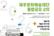 뉴스다 최광묵 기자 | 제주문화예술재단은 도내 예술인의 창작 활동 지원과 지속가능한 문화예술 생태계 조성을 위해 ‘2026년 지원사업 통합공모 2차’를 3월 23일까지 진행한다. 이번 통합공모는 ▲예술창작지원 ▲K-Art 청년예술인 지원 ▲예술인복지지원 ▲문화예술교육지원 ▲지역문화지원 등 5개 부문 18개 유형으로 진행된다. 특히 이번 공모에서는 변화하는 창작 환경에 발맞춰 ‘인공지능(AI) 창작 실험실’유형을 신설하는 등 예술인의 창작 실험과 기술·예술 융합 활동을 지원한다. 재단은 통합공모에 대한 이해를 돕기 위해 도내 예술인을 대상으로 사업설명회를 개최한다. 오는 12일과 13일에 서귀포삼다종합사회복지관과 제주아트플랫폼에서 각각 진행되며, 사업별 공모 주요 내용을 안내할 예정이다. 신청 대상은 제주도에 주소를 둔 예술인과 예술단체다. 다만 사업별 신청 자격과 세부 기준이 달라 공고문을 반드시 확인해야 한다. 자세한 공모내용과 세부일정은 재단 누리집에서 확인 가능하다. 지원 신청은 국가문화예술지원시스템(NCAS)을 통해 접수하며, 선정 결과는 심의를 거쳐 4월 중 재단 누리집에 공고할 예정