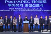 뉴스다 최광묵 기자 | 경상북도는 27일 서울 인터컨티넨탈 호텔에서 POST APEC 경상북도 투자유치 비전 선포식을 개최했다. 선포식에는 양금희 경상북도 경제부지사와 22개 시군 단체장, 아시아·태평양 20개국 대사관과 투자자, 대한상공회의소, 경제인 등이 참석한 가운데, POST APEC 경상북도 투자유치 이니셔티브를 발표하고 다 함께 의지를 다졌다. 이날 선포식은 공항투자분야 APEC 성과 발표, POST APEC 경상북도 투자유치 이니셔티브 브리핑, 비전 선포문 낭독, 경제부지사 및 22개 시군 단체장 선포문 서명 세리머니, 기념 촬영 순으로 진행됐다. 먼저 APEC 기간을 전후한 공항투자분야 주요 성과 발표로 지난 2024년 APEC 개최지 최종 선정에 힘을 보탠 ‘포항시·경주시·포항경주공항·경북문화관광공사 5개 기관’의‘APEC 정상회의 유치 및 포항경주공항 국제선 취항을 위한 업무협약’체결을 시작으로 APEC 성공 개최를 위한 ‘KOTRA, 한국아태경제협회’와의 업무협약을 연이어 체결했다. 또한, APEC 개최 준비와 연계한 ‘경주 SMR국가산단 투자설명회’, 경상북도 투자대회 ‘데