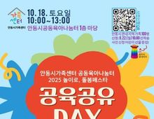 뉴스다 최광묵 기자 | 안동시는 오는 10월 18일 오전 10시부터 오후 4시까지 '2025 놀이로 돌봄페스타 “공육공유 DAY”'를 개최한다. 이번 행사는 안동시와 안동시가족센터가 함께 추진하는 공동육아나눔터 사업의 일환으로, 안동시공동육아나눔터 1호점(안동시 번영1길 55)과 2호점(경상북도청 복지관)에서 각각 진행된다. 행사는 1호점에서 오전 10시부터 13시까지, 2호점에서는 오후 1시 20분부터 4시까지 열린다. 각 현장에서는 온 가족이 함께 즐길 수 있는 벌룬쇼 가족공연, 아이들의 상상력을 자극하는 페이스페인팅, 가족의 웃음을 담는 캐리커처 이벤트, 그리고 장난감을 나누는 ‘장난감 정거장’ 교환 프로그램 등 다채로운 프로그램이 진행된다. 특히, ‘장난감 정거장’은 이번 행사의 특별한 체험 프로그램으로, 가정에서 사용하지 않는 장난감 1개를 가져오면 새로운 장난감 1개로 교환하고, 동시에 체험존을 무료로 이용할 수 있다. 이를 통해 ‘나눔과 순환의 가치’를 배우고, 환경친화적인 육아 문화 조성에도 기여할 것으로 기대된다. 안동시 관계자는 “이번 돌봄페스타는 부모가 혼자 돌보는 육아에서