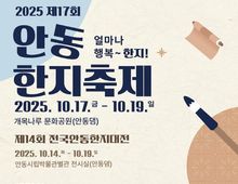 뉴스다 최광묵 기자 | 경상북도와 안동시가 후원하고 (사)안동한지문화진흥회가 주관하는 제17회 안동 한지축제가, 오는 10월 17일부터 19일까지 3일간 안동시 월영교 개목나루 문화공원 일원에서 개최된다. 올해 한지 축제는 ‘얼마나 행복한지’를 주제로 한지를 통해 일상 속 행복과 전통문화의 가치를 발견하는 뜻깊은 행사로 꾸며진다. 특히 이전 축제와 달리 도심과 가까운 월영교 문화공원 일대로 장소를 옮기면서 접근성과 관람 편의성이 크게 향상됐고, 월영교의 아름다운 자연과 야경이 한지의 고즈넉한 멋과 어우러져 감성적인 가을 정취를 더할 예정이다. 행사 기간 △한지 서책만들기 △한지용돈봉투 만들기 △까치호랑이목련 그리기 △한지풍경 만들기 △꽃신 만들기 △연사키링 만들기 △한지등 만들기 등 한지를 이용한 다양한 한지 체험 프로그램이 운영된다. 또한 △한지 백일장 △한지뜨기 △한지 소원쓰기 △한지 포토존 △한지네컷 등 남녀노소 누구나 참여가 가능한 다양한 이벤트가 관람객을 맞이할 예정이다. 행사 관계자는 “가족 단위 방문객, 연인, 국내외 관광객 모두가 만족할 수 있는 다양한 체험과 이벤트가 마련된 이번 축제가, 안