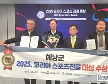 뉴스다 류대현 기자 | 해남군이 2025 코리아 스포츠진흥대상에서 리더부문 대상을 수상하며 스포츠마케팅 역량을 인정받았다. 코리아 스포츠진흥대상은 대한민국 스포츠 진흥과 발전에 기여한 스포츠단체, 지방자치단체, 기업, 인물 등을 선정해 모범적 사례를 널리 알리기 위해 2019년 제정된 상으로, 올해로 7회째를 맞았다. 스포츠동아에서 주최하고, 문화체육관광부와 대한체육회, 국민체육진흥공단에서 후원하고 있다. 시상식은 18일 서울시 종로구 동아미디어센터에서 열렸다. 해남군은 리더부문 대상으로, 올해 전국단위 대회와 전지훈련팀 유치를 통해 130억 원 규모의 직간접 지역경제 활성화 효과를 창출하고 안정적인 스포츠마케팅 모델을 구축한 점을 높이 평가받았다. 특히 지난 10월 국내 유일의 LPGA 정규대회인‘2025 LPGA BMW 레이디스 챔피언십’을 성공적으로 개최해 세계적인 스포츠마케팅 역량을 인정받은 바 있다. 이번 LPGA대회에는 6만여명의 관람객이 방문하면서 60여억원의 경제효과를 거둔 것은 물론 성공적인 대회 운영으로 해남을 전세계에 알리는 계기가 됐다는 평가이다.