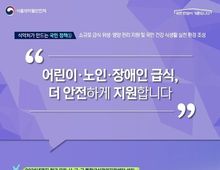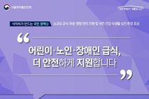뉴스다 최광묵 기자 | 식약처가 만드는 국민 정책 - 소규모 급식 위생·영양 관리 지원 및 국민 건강 식생활 실천 환경 조성 "어린이·노인·장애인 급식, 더 안전하게 지원합니다." 2026년까지 전국 모든 시·군·구 통합급식관리지원센터 설치 · 2025년 166개소 → 2026년 228개 시·군·구 운영 확대 · 전국 어디서든 소규모 시설의 급식 안전 서비스 제공 사각지대 없는 급식 안전관리 지원 · 어린이집·사립유치원·아동복지시설 급식소 · 요양원·주간보호시설 등 노인복지시설 급식소 · 거주·재활시설 등 장애인복지시설 급식소 현장에서 체감하는 위생·영양 관리 지원 · 급식소 위생·영양관리 순회 방문 지도 · 시설장·조리원 대상 식품안전 및 식생활 교육 · 대상(어린이·노인·장애인)별 특성 고려 맞춤형 식단 제공 [뉴스출처 : 식품의약품안전처]