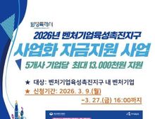 뉴스다 최광묵 기자 | 화성특례시와 화성산업진흥원(원장 전병선)은 화성동탄테크노폴 벤처기업육성촉진지구 내의 벤처기업의 성장을 지원하기 위해‘2026년 벤처기업육성촉진지구 사업화 자금지원 사업’ 참여기업을 오는 3월 27일까지 모집한다. ‘2026년 벤처기업육성촉진지구 사업화 자금지원 사업’은 ▲개발 ▲사업화 ▲ 마케팅 등 제품 시장 진출에 필요한 전 과정을 기업당 최대 1,300만원을 지원하는 사업으로, 시제품 제작부터 홍보까지 기업 맞춤형 원스톱 지원이 가능하다. 지난해 참여기업 5개사는 매출 2억 5천만원, 지식재산권 획득, 신규고용 3건의 실적을 창출하며, 화성시 유망 벤처기업의 성장 지원에 대한 실효성을 입증했다. 화성동탄테크노폴 벤처기업육성촉진지구에 소재한 벤처기업을 대상으로 모집하며, 서류 및 발표평가를 거쳐 총 5개 기업을 선정할 예정이다. 전병선 화성산업진흥원장은 “이번 사업이 촉진지구 내 벤처기업의 성장을 이끄는 마중물이 되길 바란다”며, “기업들이 기술 개발 성과를 시장으로 연결하여, 고용과 매출 증대로 이어지는 자생적 성장구조를 조성해 나가겠다”고 밝혔다.