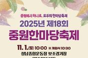 뉴스다 최광묵 기자 | ‘제18회 중원한마당축제’가 오는 11월 1일 오전 10시부터 오후 2시 30분까지 2000여 명이 참석한 가운데 성남종합운동장 보조경기장에서 열린다. 성남시 중원구가 후원하고, 중원한마당축제 추진위원회가 주최·주관해 열리는 이번 행사는 ‘중원에서 하나로, 모두의 한마당 축제’를 주제로 진행된다. 이날 특설무대에선 11개 동 주민 대표가 출연해 넘치는 끼와 노래 실력을 선보이는 ‘우리 동네 인기스타’ 공연이 펼쳐진다. 초청 가수 윤수현의 ‘천태만상’ 등 트로트 공연, 신인 아이돌 걸그룹 아스텔의 ‘슈퍼노바’, ‘아일랜드’ 등의 공연, 중원유스센터 청소년 보컬 동아리와 댄스 동아리 공연도 열려 축제 분위기를 달군다. 시민 체험 행사도 다양하다. 행사장 곳곳에 총 11개 체험 부스를 설치해 4차산업과 관련한 드론 축구, 가상현실(VR) 트럭 체험, 배틀 로봇 등과 페이스페인팅, 목공 체험 등을 해볼 수 있다. 중원구 관계자는 “주민 간 화합을 도모하고, 신나고 활기찬 지역 분위기를 조성하는 장이 될 것”이라고 말했다.